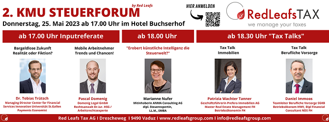 On 25 May 2023, the second edition of the SME Tax Forum took place at the Buchserhof in Buchs SG – an event format organized by Red Leafs Tax AG for entrepreneurs from Liechtenstein and Eastern Switzerland. Once again, this edition offered a platform for tax topics of entrepreneurial relevance – concise, practice-oriented, and with room for exchange, discussion, and networking.